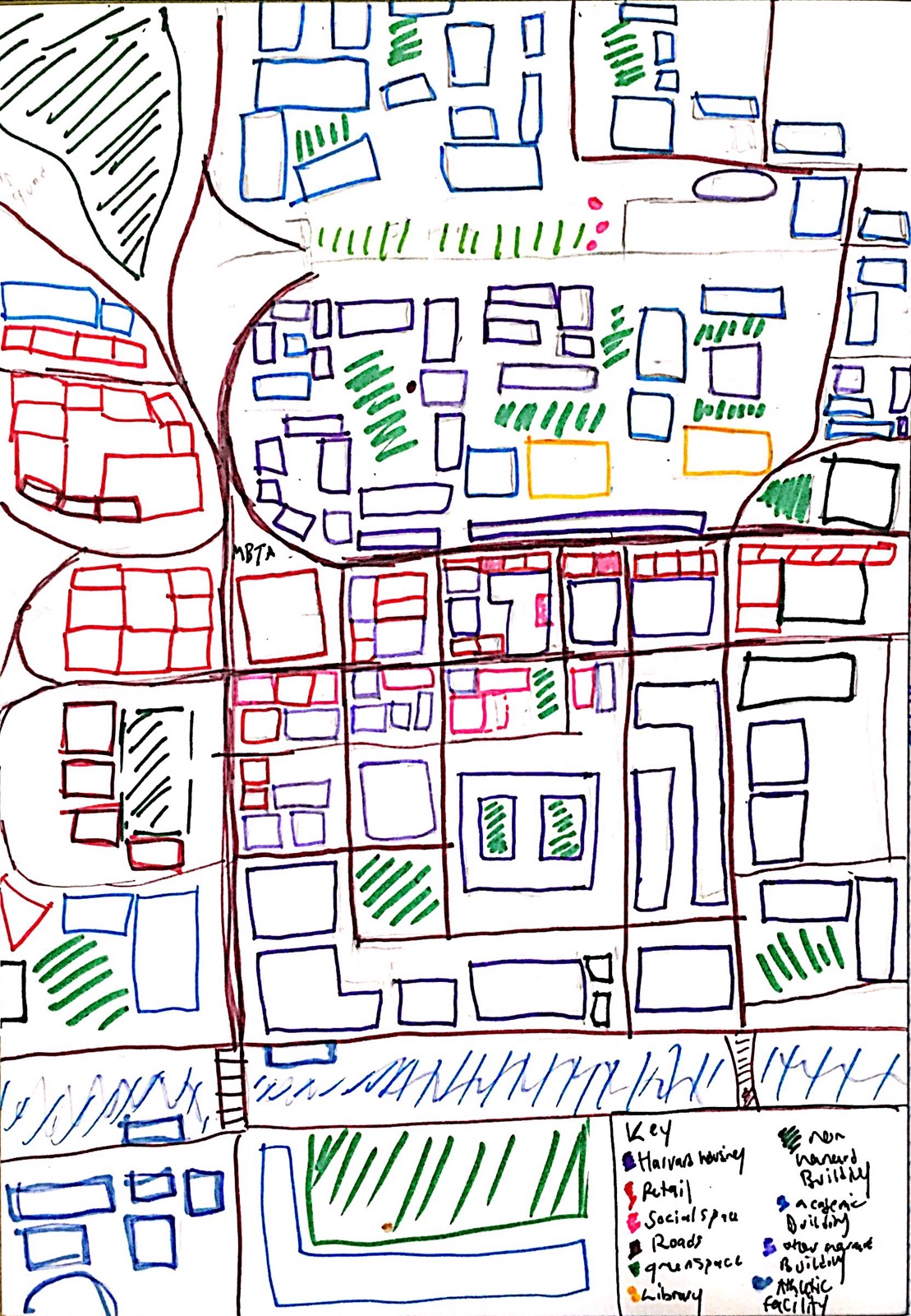 In comparing my map of Harvard square and campus, I found some striking differences, but also many similarities. The most striking difference was that I drew my map on a straight grid based on the roads in the square, but in reality the roads actually have many twists and turns. I belive my map is an accurate representation of Harvard square, I think the river houses and the yard are particularly accurate because that is where I’ve spent most of my time on campus. I believe that my map is accurate because I think a lot about where I walk everyday, and which routes might be fastest. The quad is not central to my map because it is outside of my sphere of influence. I would say most of my time is spent between the river houses and the athletic facilities. The most difficult of this assignment for me was figuring out how to scale the map so as to include detail but also to ensure that I included the entire square. What I thought was most interesting about this assignment was how this map made me think about the square differently, for example I began the map by drawing out the houses, and based the scale around tat, but I think the most important/entertaining part of the square is the retail.