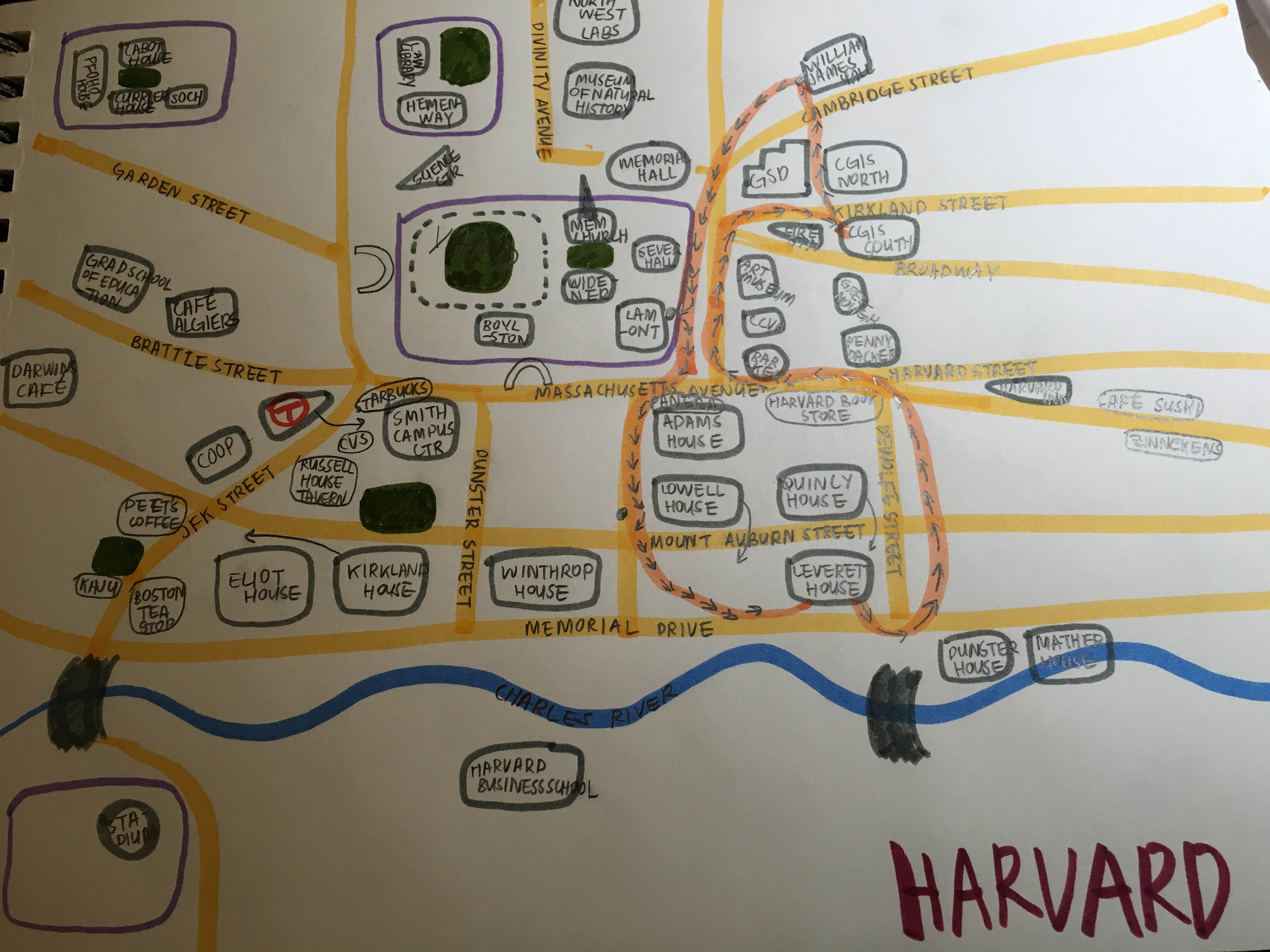 This leads me to conclude that I mapped out Harvard based on my experience of Harvard. The best example of this is that I completely failed to account for the bend in the river and imagined it as a straight line, especially because that is how I feel when I walk along the river. The map is also (as I had expected) not even close to scale, particularly because I imagine some spaces to be much larger based on the importance they have in my life.
