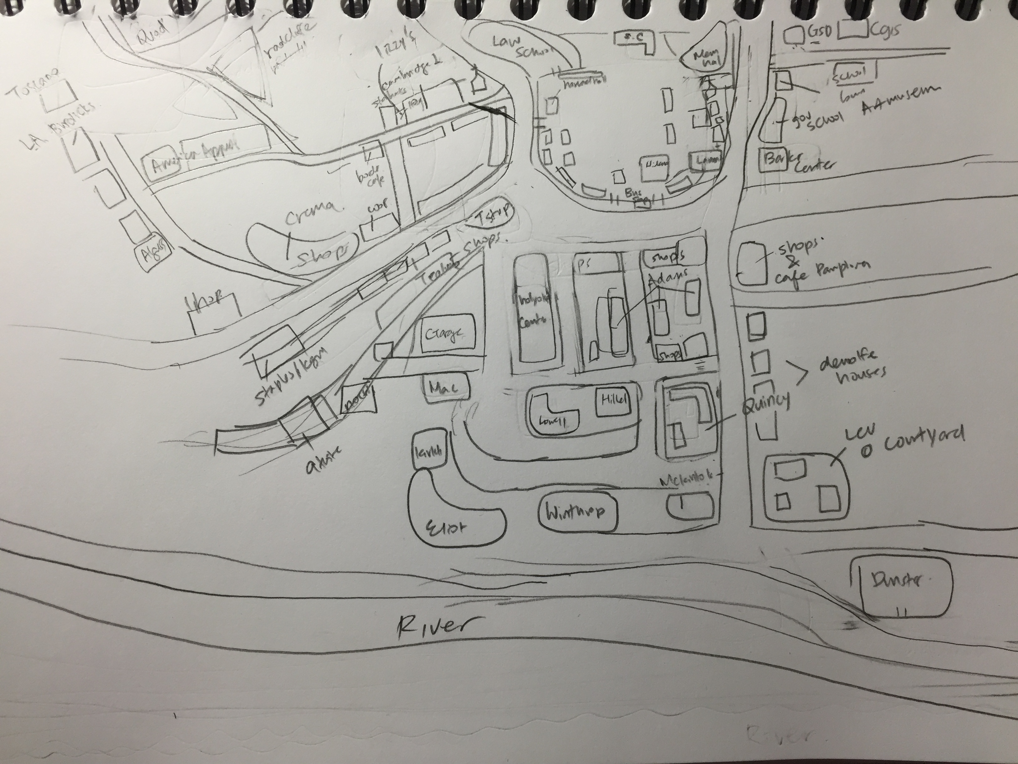 I was concerned about this project because I have a terrible sense of direction. Part of it is due to the fact that because of a leg condition I have, I have not walked around too much and been able to explore large areas as much as others. Also, since I’m from Korea, where one doesn’t drive until a pretty late age, I have little driving experience. Hence, only having been driven around—which requires less concentration then actual driving—I found that when making this sketch as well, I was not very aware of roads nor have a spatial sense that one acquires when one walks and actively takes in their environment. I was pretty familiar with the River House area where I am used to walking around in (Leverett- Quincy- Adams House on the Bow Street side) because I live in Leverett House and have walked those streets on my way to and back from class. Also, since I viewed Leverett, where I live as the focal point, I subconsciously drew those houses on the River much larger, with everything else away from the houses close to the river—Harvard Yard, the Square, especially the Quad area progressively smaller. In my mind, I seemed to have had a subconscious sense of perspective, when since this is a bird’s eye view, would not necessarily exist. Although I was pretty familiar with the location of houses near the River, I was lost to where the roads lay, and their proportion to the buildings—probably because I’ve never driven around the River House area. I was also completely unaware of where the Quad is located—because with my leg, I had never directly walked to the quad, only using the shuttle for my occasional visits, which tend to meander and stop at various locations. Also, I noticed that in Harvard Square, because I’m more focused on getting to the one store I am headed to amongst the throng of people (which makes it very difficult for me to concentrate) rather than leisurely taking in my surroundings that it was difficult for me to remember the shops as a continuum, or even how many streets are in the square (which is something I forget in real life as well). The map I drew generally reflected my understanding and experience of Harvard Square—I remembered better places I had walked to-and-fro more often (River House Area near Lev, down Quincy Street & Bow street where most of my classes are located) and either the places I visited most often or places I was completely oblivious to (Eliot House) were drawn larger.