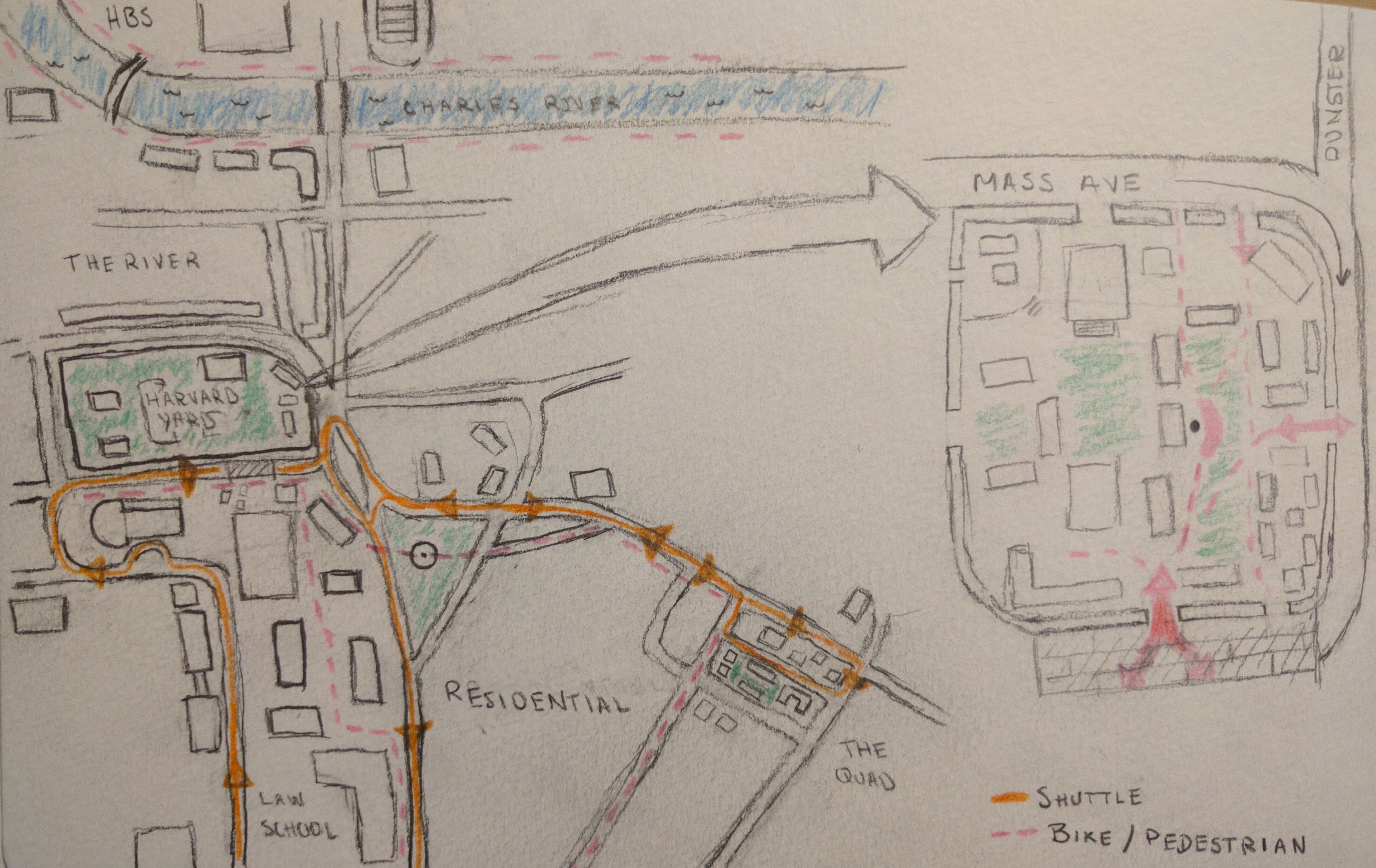 Two other noteworthy conclusions can be drawn from my sketch of the square. The first is the choice of buildings that appear on my sketch. Mostly academic buildings, the buildings I use most frequently, appear instead of commercial buildings on the square. The second is the flow of people either taking shuttles or walking/biking between the quad and Harvard Yard. What stood out to me was that that pedestrians often traversed green spaces like the yard or Cambridge commons.