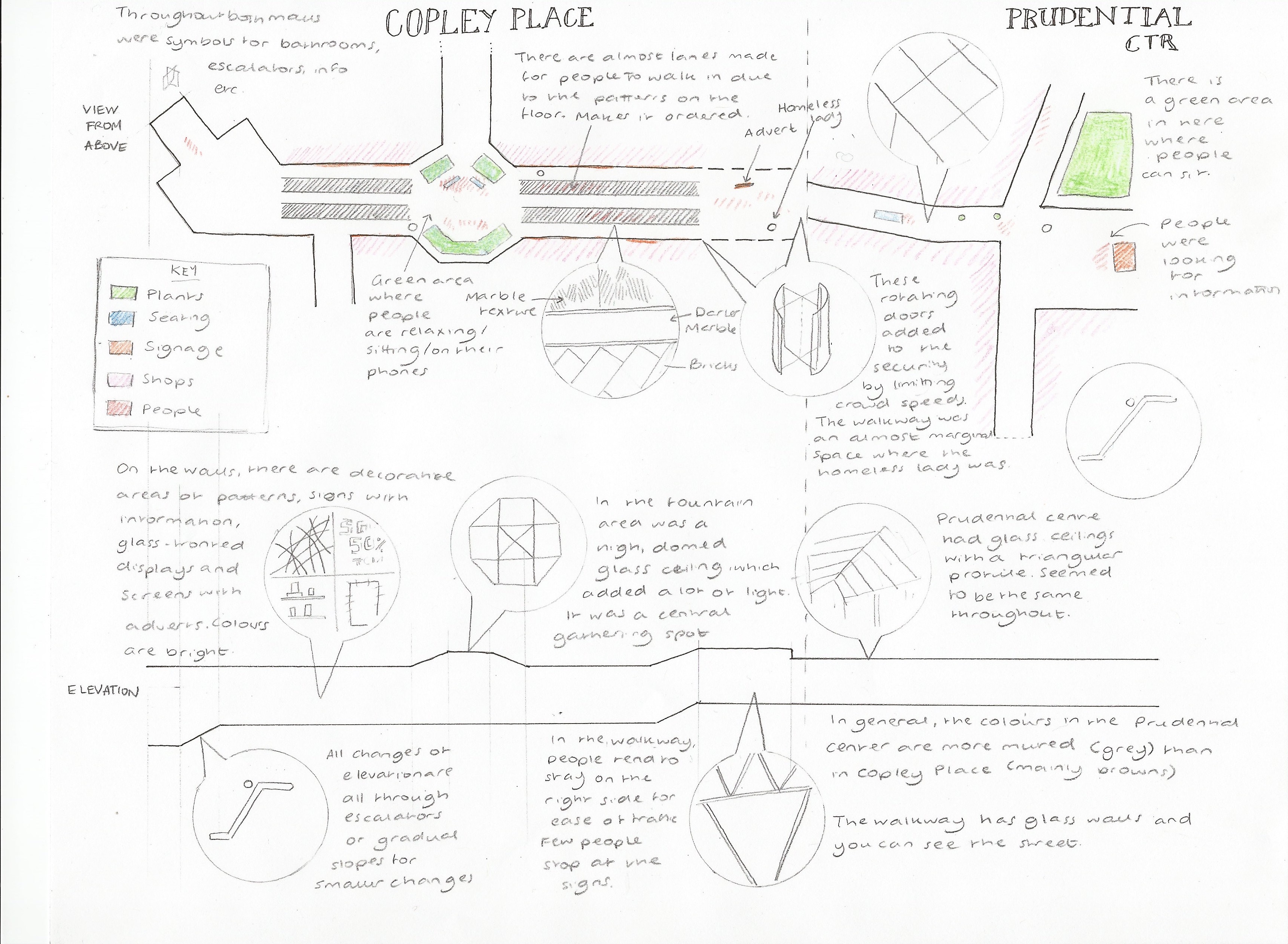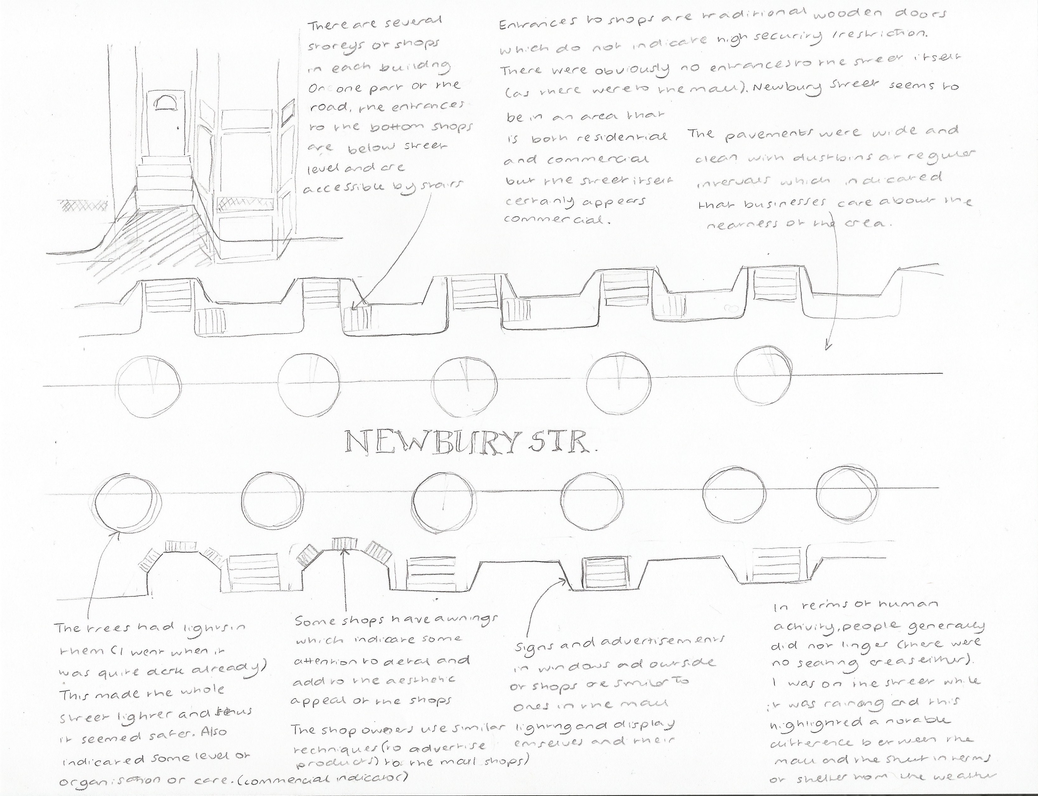 The malls and Newbury Street perform similar functions in notably different ways. While the malls are very clearly highly designed and decorated (with patterns on the walls, floors and ceilings), Newbury Street has rustic and authentic infrastructure, with some modifications that create a commercial space. For example, the streets are exceptionally clean and fairly even. There are trees at regular intervals which have lights on them and this adds to the feel that the area has been somewhat contrived to create a commercial space. While the malls have central areas for people to stop and sit, Newbury street does not have any seating areas and so the pavement itself is mainly for people to pass the shops and see what is available. The malls are somewhat more exclusive due to being physically enclosed with rotating doors on all the entrances. While Newbury Street is not physically a closed space, it still feels quite exclusive due to the high-end shops and clear signs of wealth. While both the malls and the street use posters for advertising, the malls had the posters all over the outside of the shops and the street had them only stuck in some of the windows or on little signs outside the front. The street’s advertising was more subtle. The mall had designated green areas and then street had the trees, as well as some bushes in front of some of the shops. However, while people were able to sit in the green areas in the malls, they were not able to do so on the street and so they functioned in different ways.