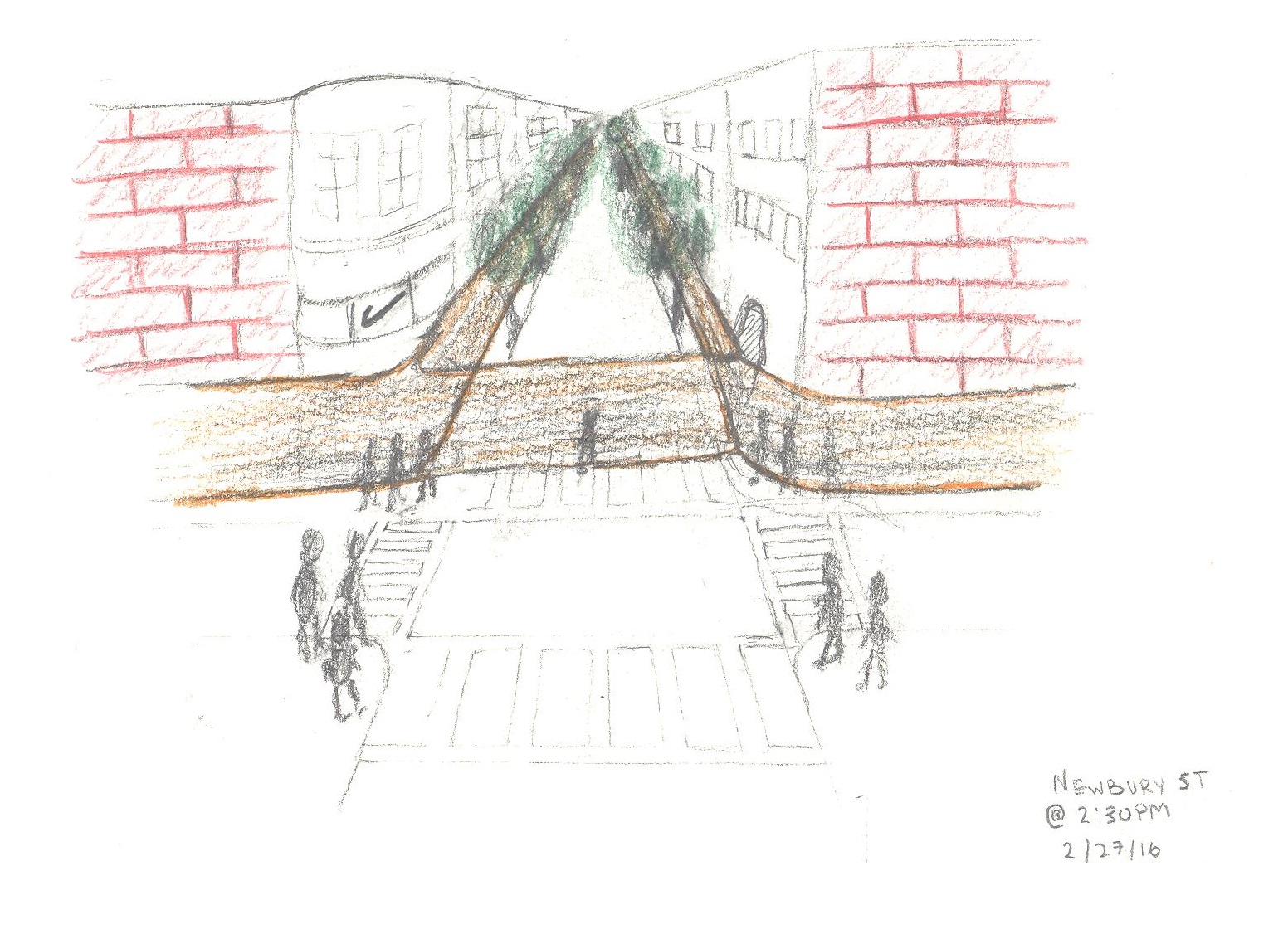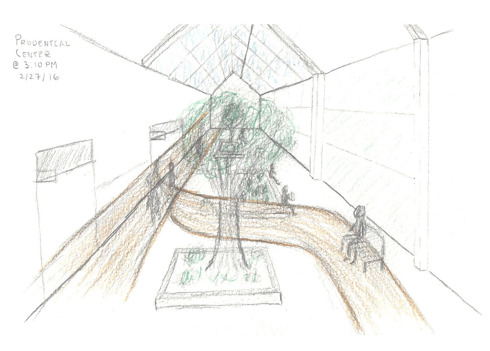 The aspect of the spaces that I most vividly recall was the ease (or lack thereof) at which I was able to move throughout the space. While both spaces were occupied by a nontrivial amount of other individuals, the design of Newbury Street lent itself to a more natural, unobstructed pedestrian flow, than in the Prudential Center. The linear nature of Newbury Street allowed pedestrians to walk in a manner in which they were only obstructed by cars and each other.Whereas, in the Prudential Center, it was as if there was always something “artificially placed” in the way of movement such as a kiosk or the sinuous, seemingly endless corridors. One of these “obstructions” which I found fascinating and try to convey in my sketch was the use of artificially placed nature, such as trees, flowers, etc. When comparing the two spaces, it was interesting how the placement of trees can be used to complement pedestrian flow along the shops (Newbury Street), or can be used as an obstacle to redirect flow to shops and places of commerce.